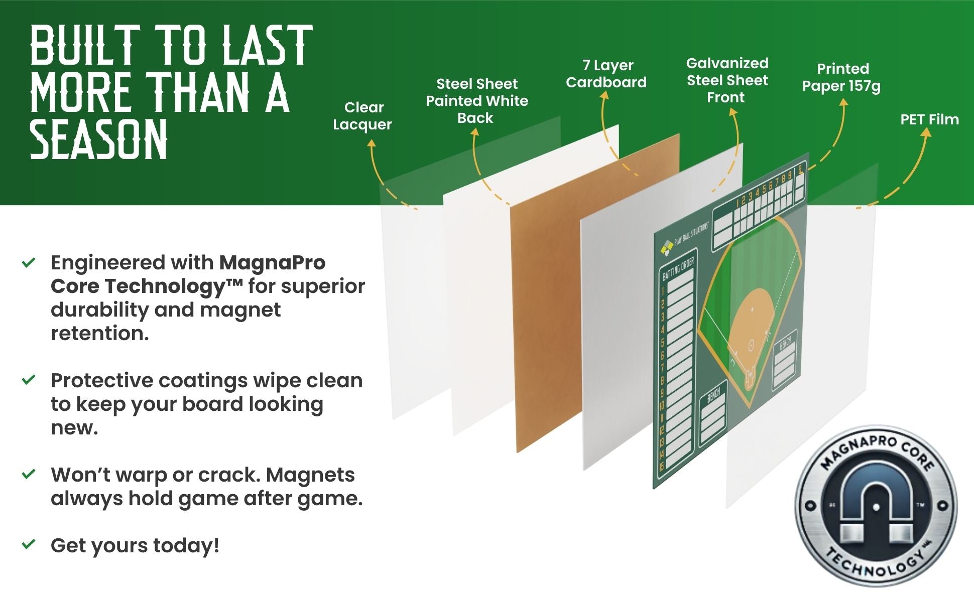Unlike PVC position boards that warp in extreme heat or crack in the cold, this baseball coaches board is built with MagnaPro Core Technology and designed to withstand the dog days of summer down south and spring and fall ball up north.