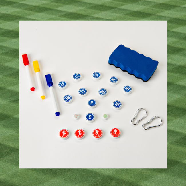 Board comes with 3 dry erase markers, 1 eraser, 2 snap clips and 17 very strong magnets (11 positional, 4 base runners, 2 ball).