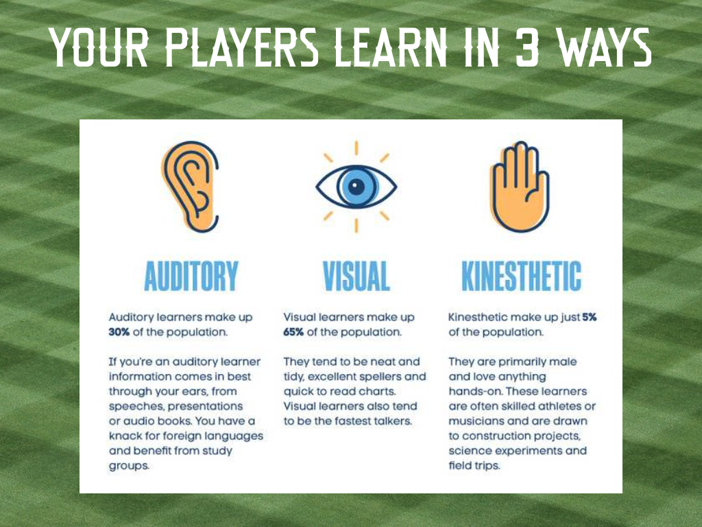 Logically, your players all have a preferred style of how they learn best. It could be visual, by hearing or by doing. Most likely it’s a combination of all three.