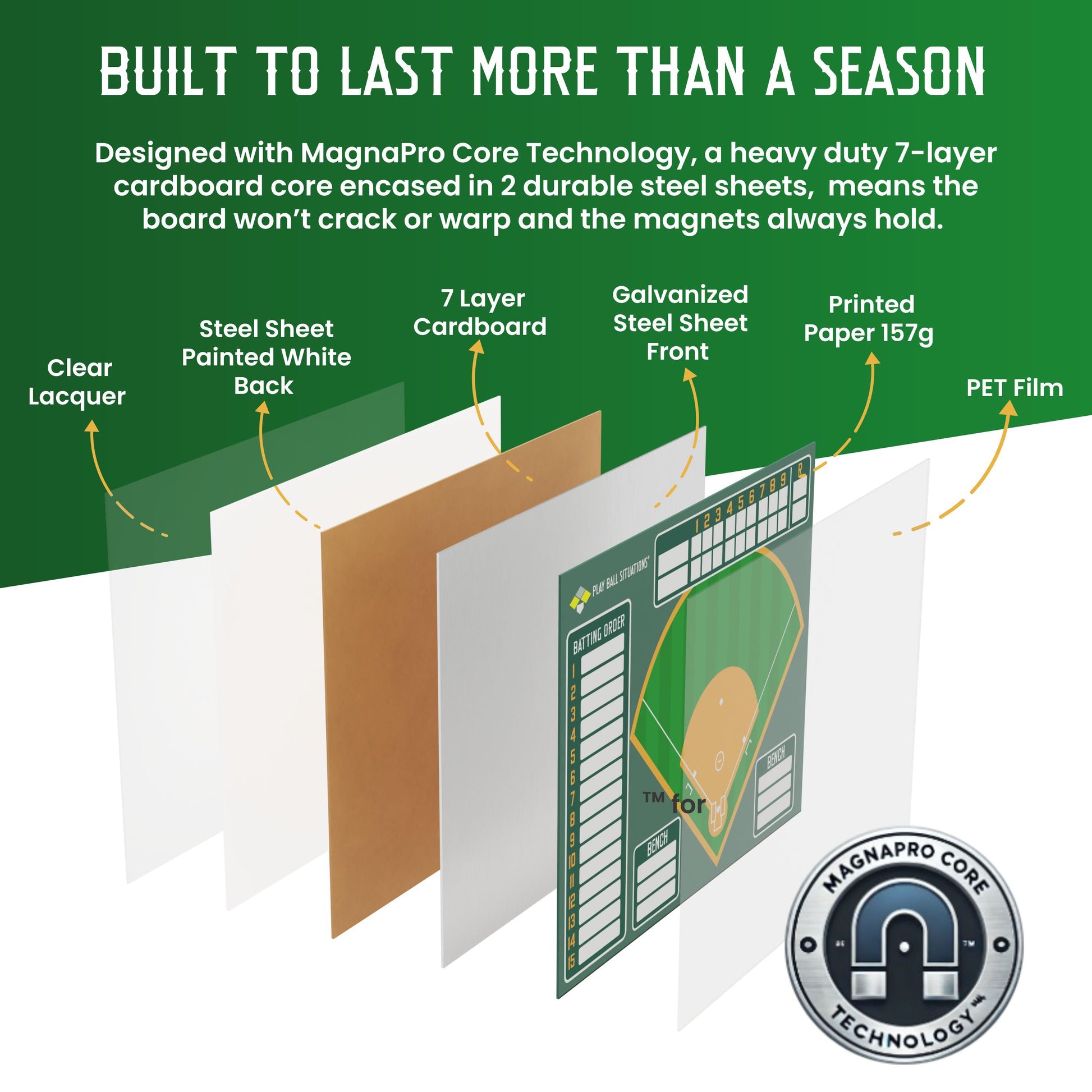 Built To Last More Than a Season - Unlike a PVC magnetic baseball board that loses magnetism because it cracks when it’s cold or warps when it’s hot, this lightweight premium baseball magnetic lineup board is made with MagnaPro Core Technology, a heavy duty 7-layer cardboard core encased in 2 durable steel sheets, which means this softball magnetic lineup board won’t crack or warp and the magnets always hold.