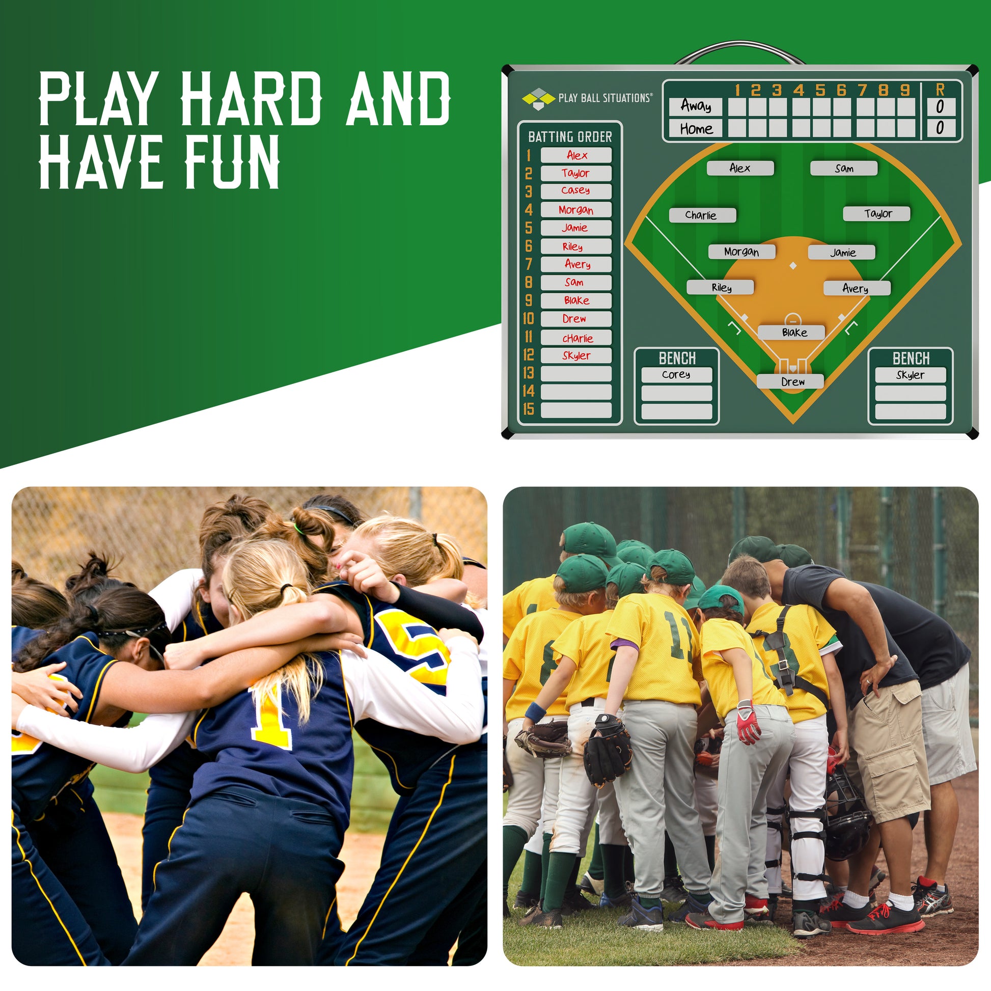 Must Have For Any Coach - From the makers of the Play Ball Situations coaches board, this 11x14 inch baseball dugout lineup board is the perfect baseball dugout organizer for baseball and softball to keep things running smoothly during games. The batting lineup board includes 30 dry-erasable magnets, 1 fence clip, 2 dry erase markers, a storage bag, and a 1-yr limited warranty, making it a risk-free baseball dry erase board for any coach. Get yours today.